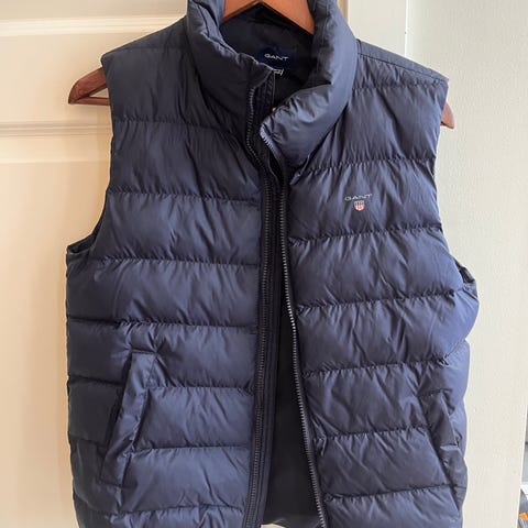 GANT dunvest for jente i størrelse 158/160 . Vesten er blå med horisontale vatterte sømmer og høy krage. . Modellen har glidelåslukking foran og sidelommer med glidelås. Innsiden har stripet fôr. Passer som ytterplagg på mildere dager eller som et ekstra lag under jakke i kaldere vær. Vesten passer for både jenter og gutter og ny pris er 900,- Hvis det er noe spørsmål så er det bare å spør