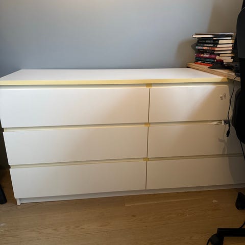Godt brukt, innsatsene er hele og fine. Hylla er modifisert. Innsatsene 50 pr stk. Hylla følger med. God plass i kommoden, trenger et malingsstrøk på toppen.