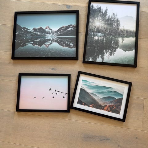 Flere ulike postere selges mot henting. Rammene som vises på bildet følger med.