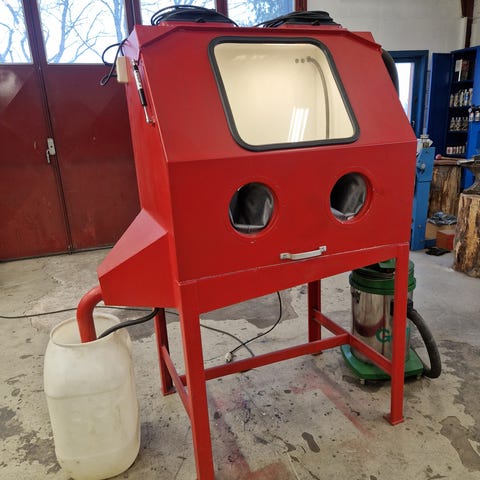 Sandblåsekabinett i rødt metall med gjennomsiktig topp lokk. Kabinettet har innebygd lysrør, gitterbunn og tilkobling for sandblåsepistol. Fronten har to åpninger med hansker for arbeid inne i kabinettet. Egnet for rengjøring, rustfjerning og overflatebehandling av mindre deler i et lukket arbeidskammer.