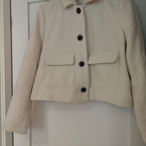 Säljer min fina tweed blazer från Calvin Klein. Den är vit med dragkedja framtill och lite glitter i materialet. Helt ny, storleken är small.
