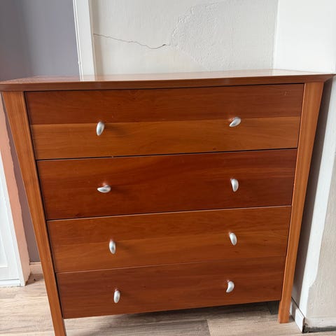 Hvit kommode med to hvite skuffer og fire bokser i tre selges.