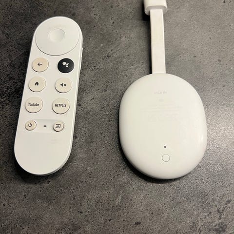 Google Chromecast med Google TV med fjernkontroll i hvit farge. Strømadapter og USB‑kabel følger med. Enheten kobles til TV via HDMI og gir tilgang til strømmetjenester og annet innhold når den er tilkoblet internett. Fjernkontrollen har dedikerte knapper for navigasjon og styring av avspilling.
