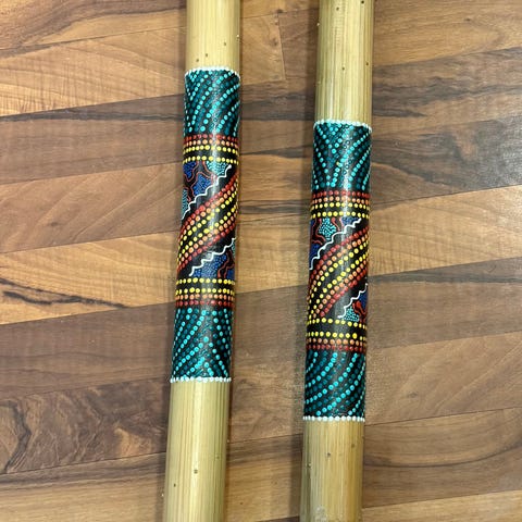 Didgeridoo treblåseinstrument laget i bambus med håndmalt dekor i tradisjonell stil. Instrumentet har naturfarget treverk med mønster i blant annet svart, hvitt og rødt, samt en vikling av tau rundt midtpartiet. Egner seg som musikkinstrument eller som dekorativ gjenstand i hjemmet.
