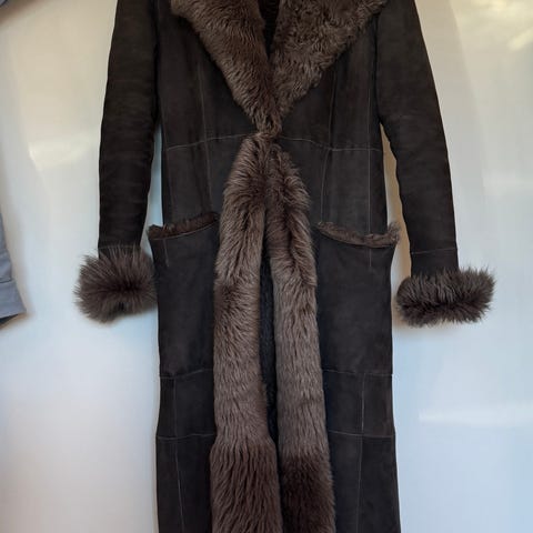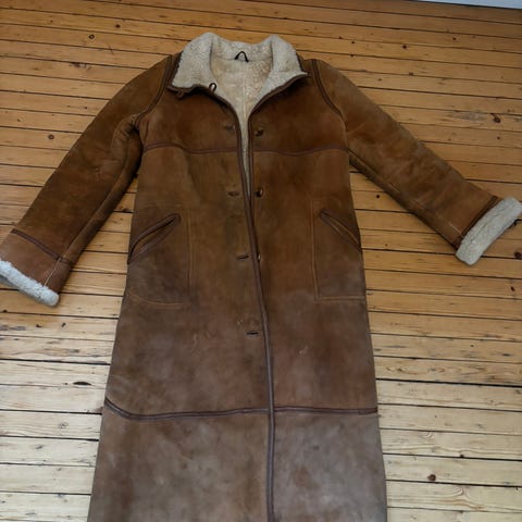 En helt spesiell lang Pelskåpe i nydelig lammepels farvetoner olivengrønn brun og lys beige smeltet i hverandre høy splitt bak og lommer ikke stor i str .