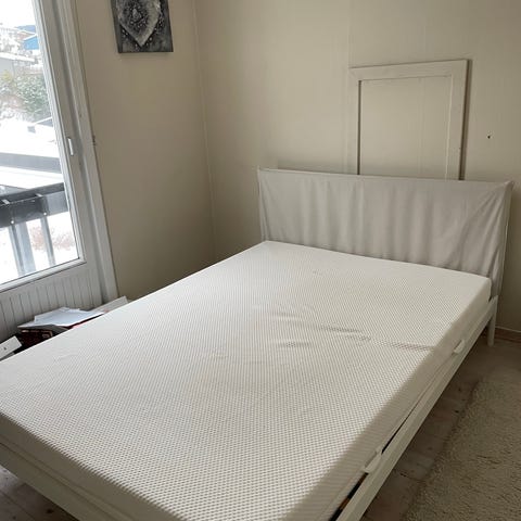 Dobbeltseng med hvit hodegalv. Noen fargeflekker på overmadrassen, men ellers i veldig god stand.
