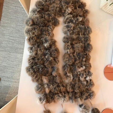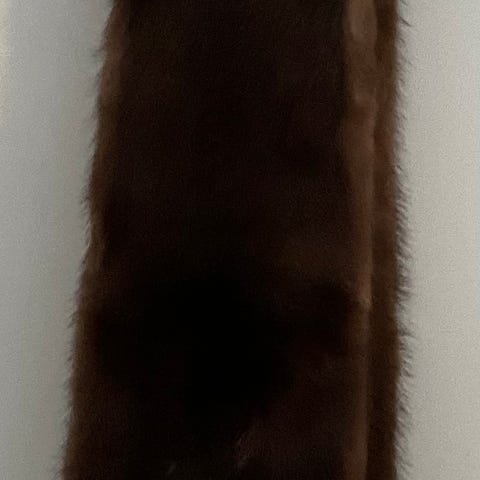 Tricot pels skjerf, kanin, med frynser. Lengde 2 meter med frynsene, bredde ca 22-23 cm. Kjøpt på Deguy i Stavanger.
