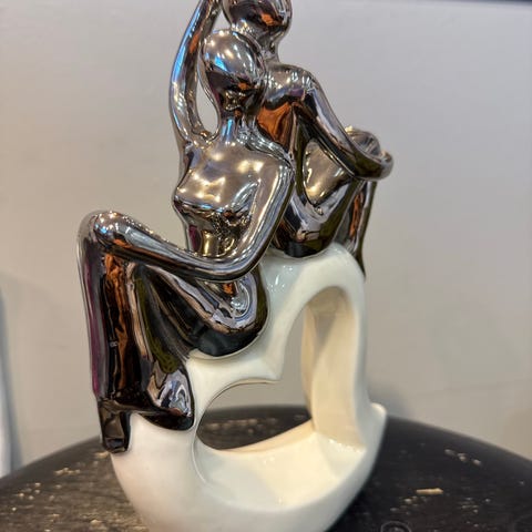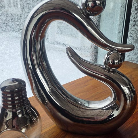 Passer som dekorativt objekt på bord, hylle eller kommode i stue, gang eller kontor. Materiale: metall. Farge: sølv.