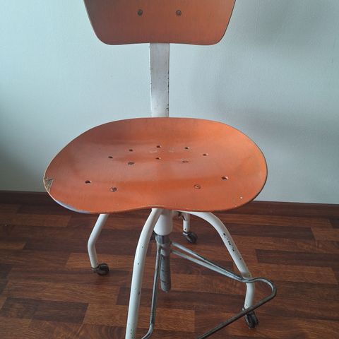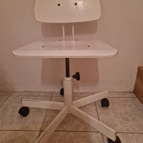 Gammel retro kontorstol med hjul. Malt treverk. Hjulene triller ikke så bra, men kan være blir bedre med litt smøring. Kan selges til 500 totalt med en lik stol i hvit.