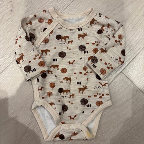 Ubrukt Hust & Claire body med ull på utsiden og bomull på innsiden, størrelse 56. Bodyen har lange ermer og er grå med mørkeblå striper og stjernemønster.