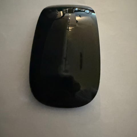 Apple Magic Mouse trådløs datamus i hvit. Musen har glatt, berøringsfølsom overflate på toppen og aluminium på undersiden. Drives av to AA-batterier som settes inn under avtakbart lokk. Egnet som tilleggsutstyr til Mac og andre kompatible enheter med Bluetooth-støtte.