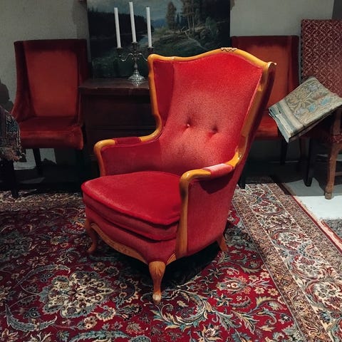 Stolen har noen skader (se bilder) i rottingen på begge armlenesidene, så selges derfor rimelig.