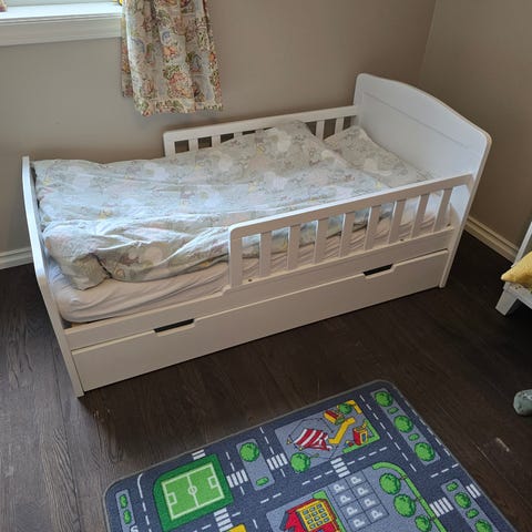 Med madrass, sengehest og tre flyttbare/uttrekkbare skuffer under. Brukt av ett barn.