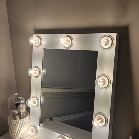 Speilet har justerbar lysstyrke og man kan bytte mellom varmt/ kaldt lys. Medfølger stikkontakt. Send gjerne pm for spørsmål eller flere bilder!