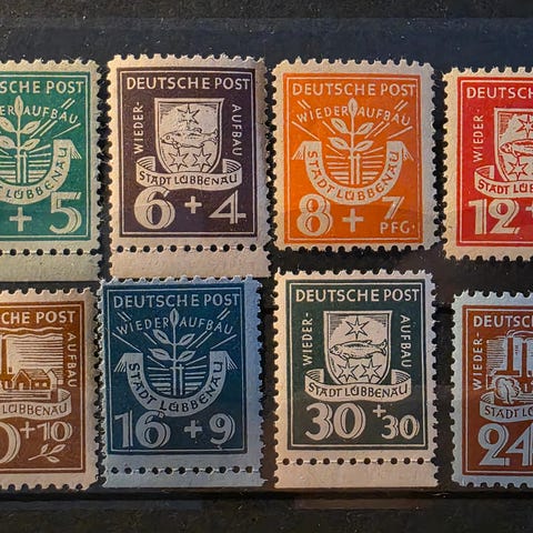 Lot frimerker fra Tyskland 1946 Russisk sone - Lübbenau. Med lim og hengselrest. Se bilde. Hentes på Jessheim eller sendes mot forhåndsbetaling pluss porto. Porto kr 30,-. Se også mine andre annonser.