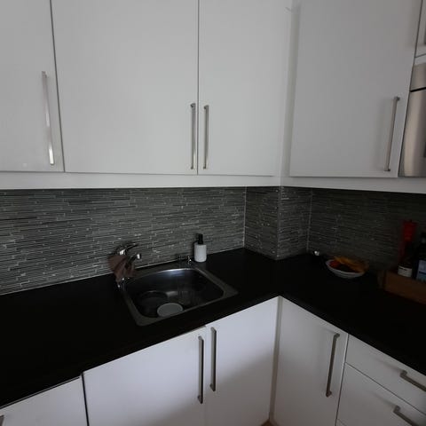 IKEA BAGGANÄS kjøkkenhåndtak i rustfritt stål. Pakken inneholder flere håndtak i to lengder 143 mm og 335 mm, med tilhørende skruer. Pakken inneholder flere enn det som er vist på bildene, totalt 16 korte og 9 lange. Merk at skruene på det ene lange håndtaket har blitt litt skjeve i bruk.