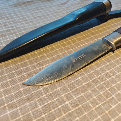 Ubrukt kniv, men den har flekker på metalldelene på skaftet. Hydro-logo på bladet. Kommer med slire og eske.