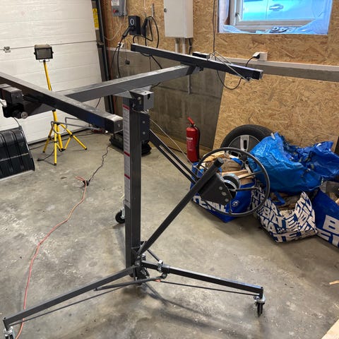 Probuilder plateskrulift gipsheis i grå metallutførelse. Løfteanordningen er konstruert for montering og håndtering av gipsplater og andre plateprodukter i tak og på vegg. Løften skjer med håndsveiv, og stativet har trebenet understell med hjul for enklere forflytning. Låsemekanisme og sikkerhetssplint er integrert i masten. Egnet til bruk på byggeplass eller ved oppussing der det er behov for å løfte og holde plater i posisjon under montering.