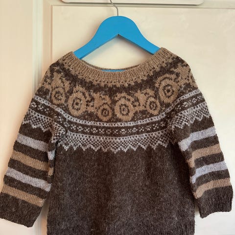 Jeg har virkelig ikke peiling på strikk - men jeg kjøpe denne nystrikket - og den er knapt brukt. Jeg mener å huske at det var alpakka ull? Men er ikke sikker: ullgenser. Den er knapt brukt. Jeg kjøpte den for 650. Noe nupper, men det går lett vekk.
