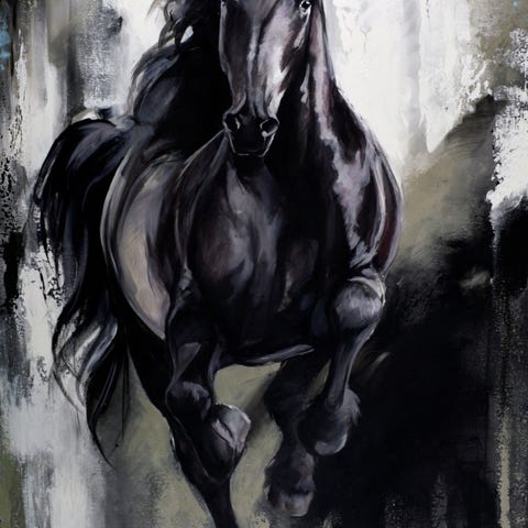 Maleri med motiv av en svart hest i bevegelse. Fargene domineres av svart, grå og lyse nyanser, med en kontrastfylt og uttrykksfull stil. Kunstverket passer som veggdekor i stue, gang, kontor eller andre oppholdsrom. Materiale og mål er ikke oppgitt.- kommer fortløpende