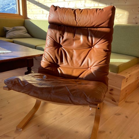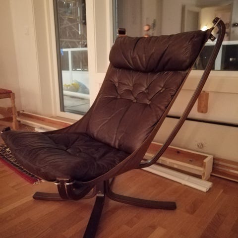 Selger retro design Falcon lenestol fra Vatne møbler. Trekket er i brun skinn og stolbein i mørkt treverk.