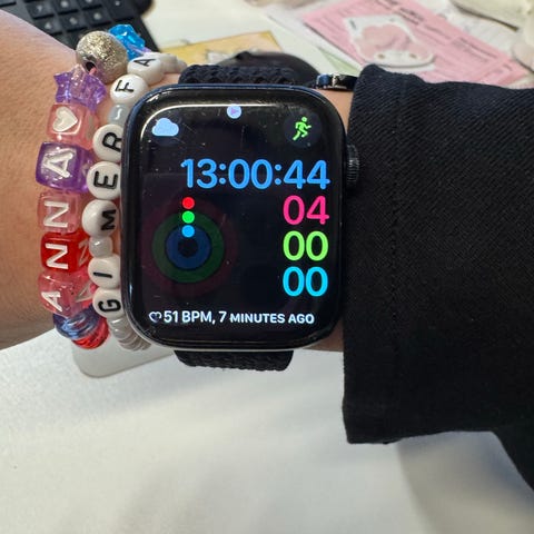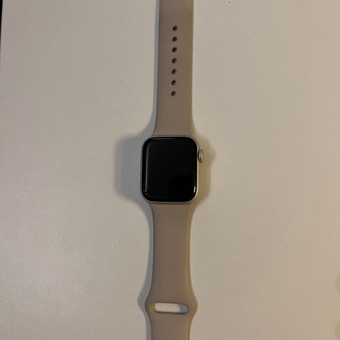 Apple Watch smartklokke med svart urkasse og lys silikonreim. Klokken har berøringsskjerm og digital krone på siden for navigasjon. Baksiden har sensorer for måling av aktivitet og puls. Reimen er justerbar og festes med klassisk Apple-spenne. Egnet til daglig bruk, aktivitetsregistrering og varsler fra iPhone.