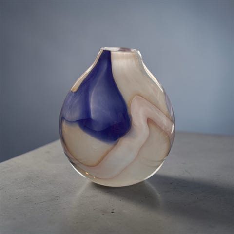 Vase i glass i turkis farge med marmorert mønster. Vasen har bølget åpning og dekorative glassdetaljer på sidene. Høyden er omtrent 20 cm, og åpningen har en diameter på omtrent 10 cm. Egnet til bruk som blomster- eller pyntevase.