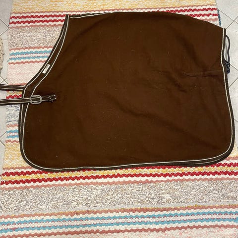 Hestedekken i burgunder med blå detaljer. Dekkenet har doble bogspenner foran, kryssgjorder under magen og halestropper. Kantet med kontrastbånd langs ytterkant. 50g