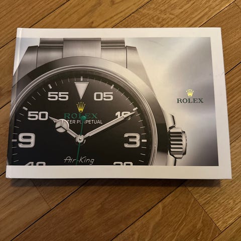 Rolex katalog bok med illustrasjoner og informasjon om klokker fra merket. Boken har stivt omslag med bilde av en Rolex-klokke på forsiden og grønn rygg med årstall trykket på. Egnet for samlere, entusiaster eller som referanseverk om Rolex-klokker.