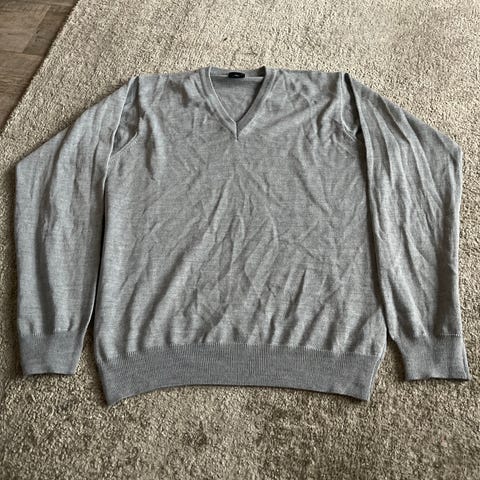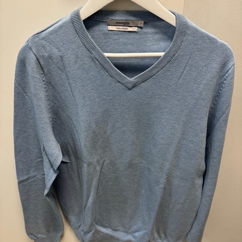 SAND Copenhagen genser for herre i størrelse S. Genseren er i grå bomull med V-hals og ribbestrikkede kanter i kontrastfarge. Den har albuelapper i blå kontrast og liten SAND-logo på brystet. Passer som en lett og behagelig hverdagsgenser eller til bruk over skjorte.