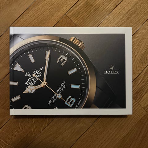 Rolex katalog 2022–2023. Trykt katalog med oversikt over ulike Rolex-modeller og spesifikasjoner for perioden 2022–2023. Viser blant annet detaljerte bilder av klokker, urtavler og lenker. Egnet som referanse for klokkeinteresserte eller som tilbehør til samling av Rolex-relatert materiale.