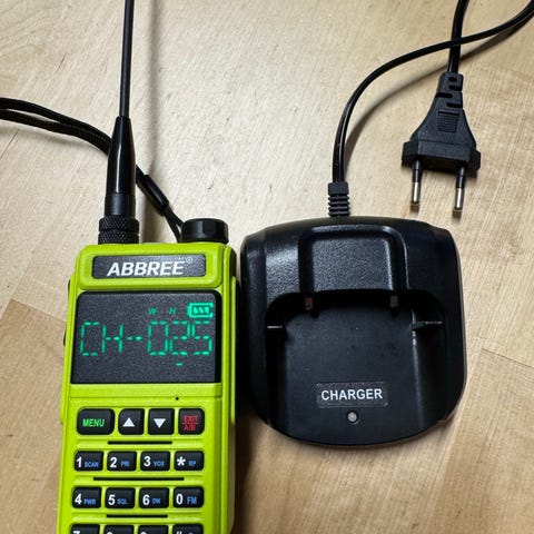 Quansheng UV-K5 håndholdt radio i svart. Enheten har tastatur på fronten, display øverst og betjeningshjul på toppen. Leveres i original eske med bordlader, strømadapter og brukerveiledning, slik det fremgår av bildene. Egnet som bærbar kommunikasjonsradio der utstyret er kompatibelt med gjeldende frekvenser og regelverk.