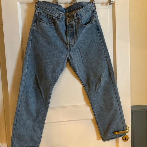 Levi's 501 jeans for herre i blå denim. Buksen har livvidde W32 og tilsvarer herrestørrelse M. Klassisk 5-lommers modell med knappgylf og beltehemper. Materiale: 100 % bomull. Egnet som hverdagsbukse og fritidsbukse.