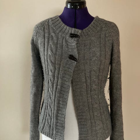 Kort strikkejakke i mønsterstrikk med glidelås. 2 små lommer med glidelås. Ullblanding, 25%mohair, 20% ull, 22% akryl og 33% nylon. Lite brukt