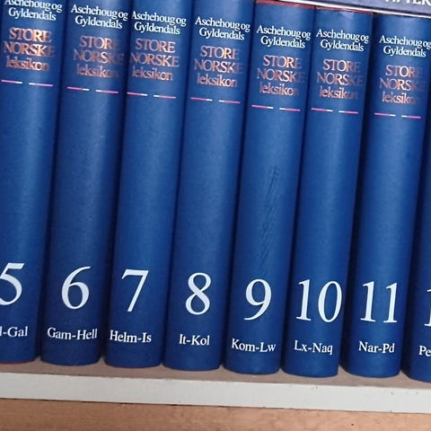 Aschehoug og Gyldendals Store Norske Leksikon bokverk i innbundet utgave. Røde bind med gullfarget ryggtekst. Alfabetisk oppslagsverk med flere bind som dekker et bredt spekter av emner. Egner seg som referanseverk i bokhylle hjemme, på skole eller kontor. 12 bind.