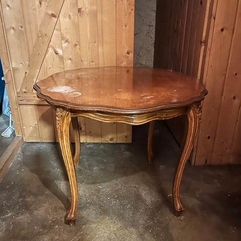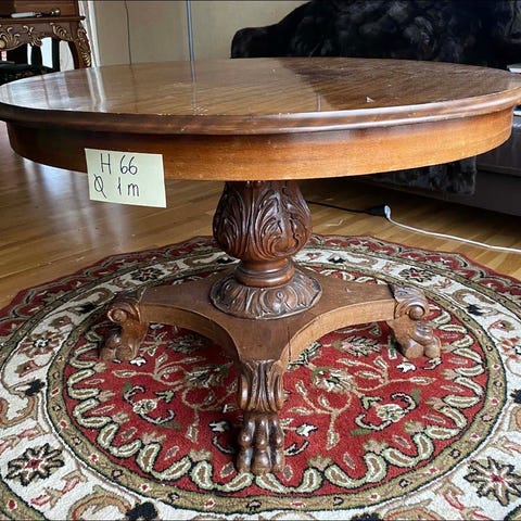 Rundt spisebord i tre med mørk bordplate. Bordet har utskårne detaljer på kanten og buede ben i klassisk stil. Egner seg som spisebord eller sidebord i stue, kjøkken eller spisestue.