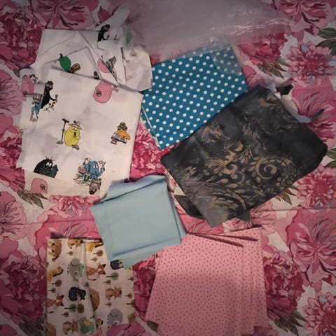 Selger bomullstoffer samlet lengde 3,6 meter. Ulike bredder fra 110 til 145 cm, se bilder.