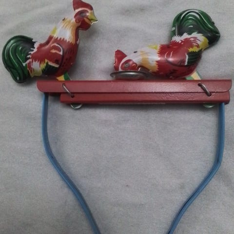 Blikkfløyte i metall med flerfarget dekorert hode og rød ende. Fløyten har flere hull langs røret for å variere tonen. Egnet som enkelt musikkinstrument eller leketøy for barn eller samlere av vintage leker og blikkleker.