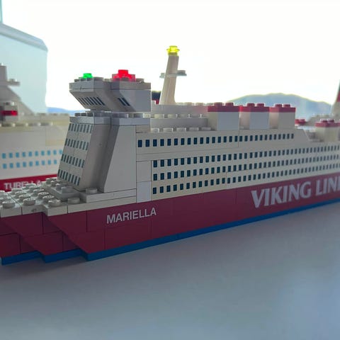 Color Line ferge byggesett i hvit og blå. Den ene er noe gulnet. Ikke original Lego, men fine modeller.