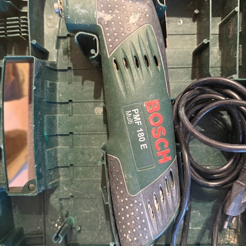 Multiverktøyet er et elektrisk oscillerende verktøy egnet til ulike oppgaver som saging, sliping og skraping i tre, plast og metall, avhengig av valgt tilbehør. Settet leveres i original plastkoffert med flere ulike tilbehørsdeler, blant annet slipeplate og ulike blader/pad-er slik som vist på bildene.