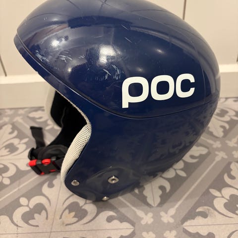 POC Skull Orbic X alpinhjelm i størrelse S. Hjelmen er hvit med svart innside og justerbar hakestropp. Ytterskall i PC/ABS og kjerne i EPP, med polstring for passform og komfort. Egnet til alpint og annen skisport der det kreves god hodebeskyttelse.