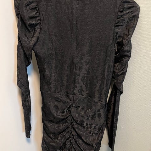 byTiMo festkjole i størrelse M for dame. Kjolen er svart og laget i viskose. Den har lange ermer, markert midje med rynkedetaljer og lett utsvingt skjørt. Stoffet har en diskré, vevd mønsterstruktur. Halsen er rund med åpning foran og knyting bak i nakken. Passer til bruk ved formelle anledninger og andre festlige sammenhenger.