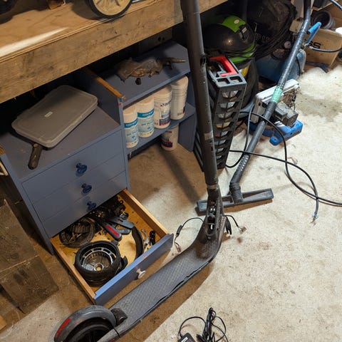 Følger med lader, ca rekkevidde 20 km. Topp hastighet er ca. 25 kmt