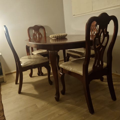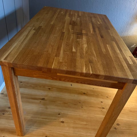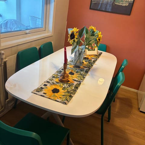 Stilrent spisebord med hvit bordplate og treben selges sammen med 6 grå stoler. Møblene er brukt, men i god stand med normale bruksspor. Komfortable stoler og et praktisk bord som passer godt til både kjøkken og spisestue.