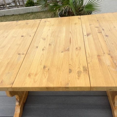 Selger dette spisestuebordet. Det er 140cm langt,men det følger med 2 lemmer. Det festes én på hver side med jernstenger som skyves inn i bordet.