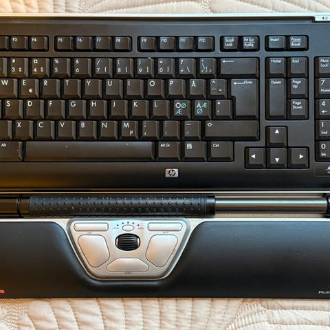 Contour RollerMouse Red Wireless ergonomisk mus som tilleggsutstyr til datamaskin. En sentrert styreenhet med rullestang foran tastaturet som erstatter tradisjonell mus. Produktet har håndleddstøtte i svart materiale og integrerte knapper for markørstyring og klikkfunksjoner. Trådløs tilkobling til PC eller Mac via medfølgende mottaker (ikke synlig på bildene). Egnet som ergonomisk pekeenhet på skrivebord sammen med tastatur.