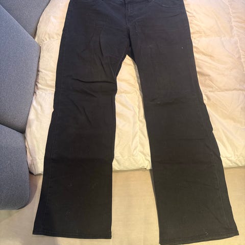 Ubrukte sorte jeans i bomull med lappen på. Fra Intown, str. 46, men liten i størrelsen. Brodert mønster på begge baklommene. Midje 92 cm, lengde fra skritet 80 cm.