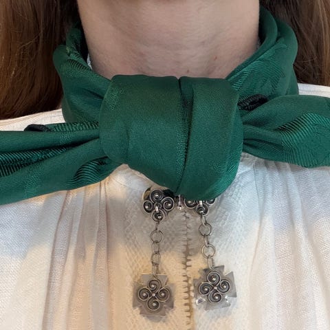 Hjemmesydd bunadskjerf sydd av duk kjøpt på gjenbruksbutikk.