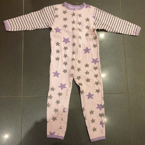 Den har lange ermer og ben, samt glidelås foran for enkel av- og påkledning. Egnet som pysj eller kosedress inne på kjølige dager. Har føtter som kan brettes over foten eller brettes opp.