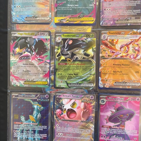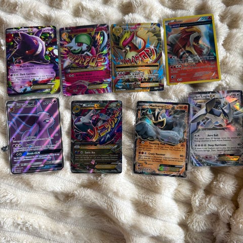 Pokemon samlekort EX og Full Art holografiske kort i blandet lot. Bildene viser flere ulike Pokemon-figurer og trenere i hovedsak som EX- og Full Art-varianter med foil/holo-effekt. Kortene kommer fra ulike sett og utgivelser innen Pokemon Trading Card Game. Egnet for samlere av Pokemon-kort eller som tillegg til eksisterende samling. Antall og nøyaktige korttyper fremgår av bildene. (AI generert)